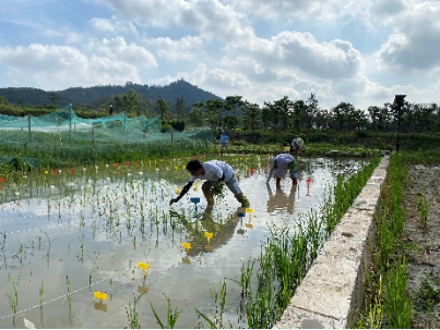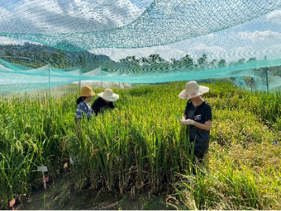 课题组成员在田间进行水稻选育相关工作