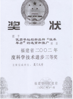 经十几年的推广应用,佳辐占使福建省早稻品种实现了从低质到优质的历史性转变,累计推广应用1千多万亩,创造了20多亿元的社会经济效益,荣获福建省科学技术奖一等奖。