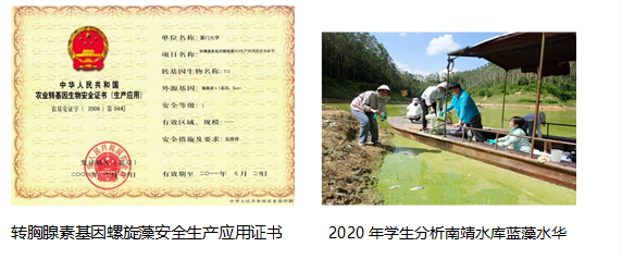 蓝藻转基因技术充分利用螺旋藻等经济藻类作为转基因受体系统和生物反应器,在适于规模安全生产的蓝藻上建立起藻类高效表达系统和生产技术,获得多项技术专利。其直接产物具备口服安全性,同时极大降低了工艺成本。2006年转胸腺素α基因螺旋藻项目获得农业部基因安全办颁发的转基因生物安全证书,是世界上首例可以规模生产应用的转基因螺旋藻。在农业领域,国家星火计划项目“转基因螺旋藻作为新型水产饲料的产业化应用”(2008-2010)成果在鳗鱼养殖上取得较好应用效果,减少了抗生素等化学药物的使用。2002年7月24日中央电视台科教频道CCTV10专题报道了我院蓝藻实验室的科研成果。时至今日,学院的螺旋藻转基因技术在国内甚至国际上仍保持着领先地位。同时,针对蓝藻藻华危害严重的问题,课题组于2003年开展蓝藻藻华爆发机制研究,初步阐明了蓝藻藻华发生发展过程中的基因表达和生物钟调控机制。