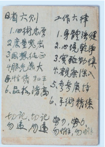 秉志先生长期随身带着一张卡片,左侧写着“日省六则”,右侧写着“工作六律”(秉志女儿发现于秉志遗物的上衣口袋中)。