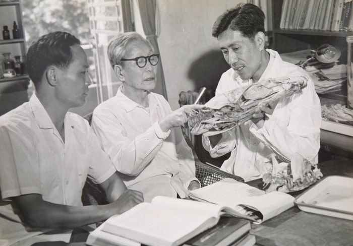 1955年中国科学院成立学部,伍献文(右三)和秉志(右六)正在讨论工作