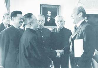 1975年7月,以周培源(右2)为团长、曾呈奎(左2)为副团长的中国科学技术代表团访美